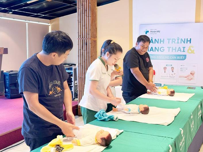 Các ông bố tương lai tham gia một lớp học tiền sản do Bệnh viện Hoàn Mỹ Đồng Nai tổ chức