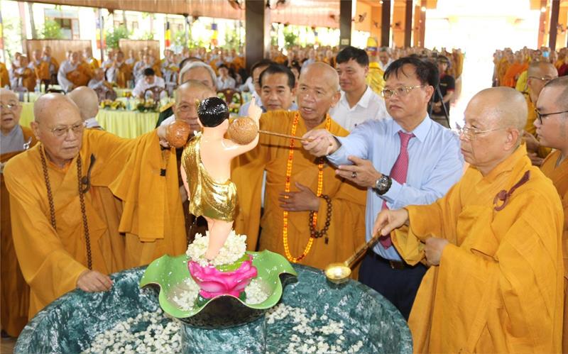 Ủy viên Ban Thường vụ Tỉnh ủy, Trưởng ban Dân vận Tỉnh ủy Cao Tiến Dũng cùng các tăng ni thực hiện nghi thức tắm Phật tại lễ Phật đản