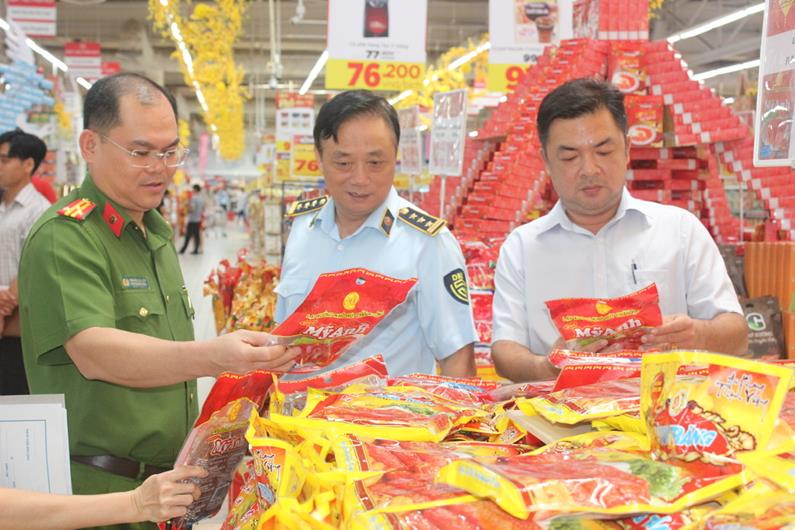 Thành viên đoàn liên ngành của tỉnh kiểm tra công tác ATTP tại một siêu thị ở H.Trảng Bom