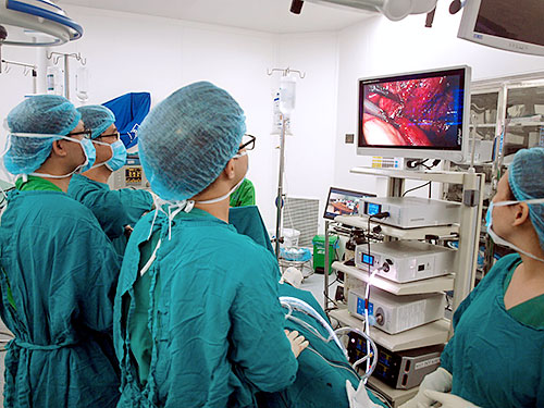 Sau khi gây mê, các bác sĩ đục 3 lỗ trên liên sườn để đưa các dụng cụ vào cơ thể bệnh nhân. Trong đó, một lỗ đưa banh kẹp, dao siêu âm; 1 lỗ đưa ống soi và lỗ còn lại đưa dụng cụ nội soi vào cơ thể bệnh nhân. Nhờ các thiết bị này mà hình ảnh bên trong cơ thể, phần nổi rất rõ nét. Trên “quãng đường” tới khối u của bệnh nhân, có rất nhiều hạch di căn xung quanh. Các bác sĩ đã nạo vét hết các cục hạch chứa tế bào ung thư và khá vất vả trong quá trình mổ bởi các phần xung quanh khối u cũng bị viêm dính. Điều đáng nói, mổ khối u phổi sẽ dính đến các mạch máu lớn, để tránh mất máu, bác sĩ đã sử dụng loại dao chuyên dụng vừa cắt, vừa khâu các mạch máu. Nhờ vậy, bệnh nhân không bị chảy máu trong quá trình mổ.