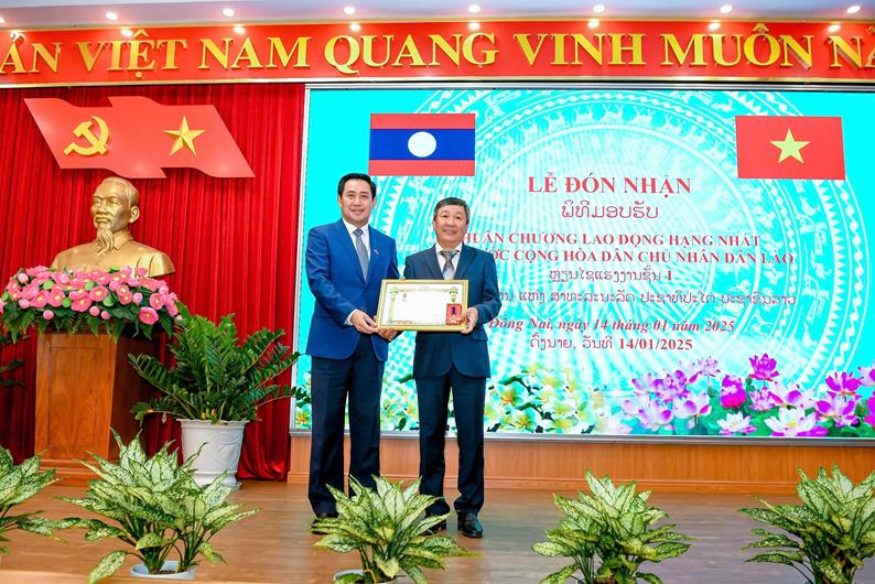 Ủy viên Trung ương Đảng, Bí thư, Tỉnh trưởng Champasak trao tặng Huân chương Lao động hạng Nhất của nước CHDCND Lào cho đồng chí Hồ Thanh Sơn – Phó Bí thư Thường trực Tỉnh ủy Đồng Nai