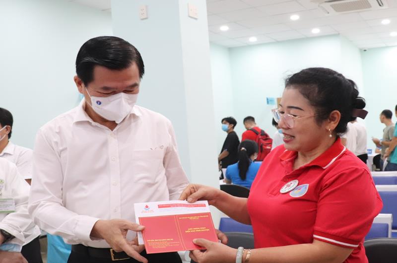 Bà Đỗ Thị Phước Thiện, Chủ tịch Hội Chữ thập đỏ tỉnh trao Giấy chứng nhận hiến máu cho đồng chí Nguyễn Hồng Lĩnh