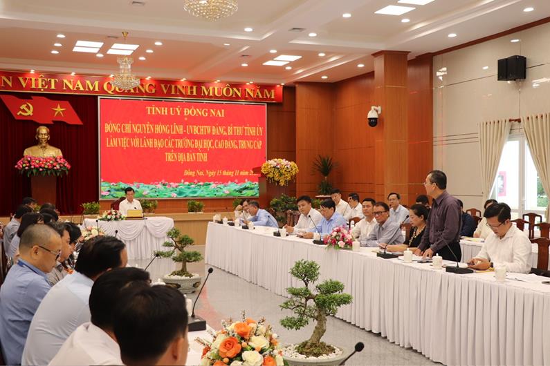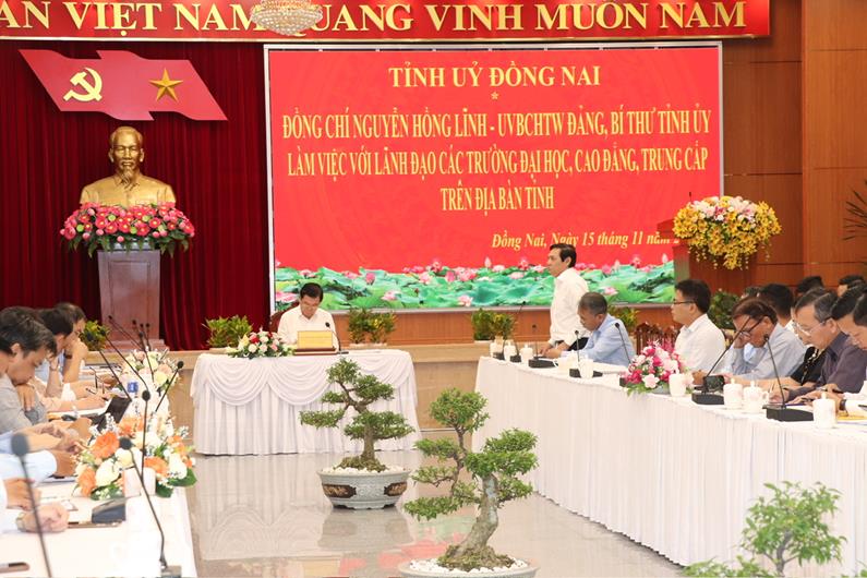 (CTT-Đồng Nai) Chiều 15-11, Ủy viên Ban Chấp hành Trung ương Đảng, Bí thư Tỉnh ủy Nguyễn Hồng Lĩnh đã có buổi làm việc với lãnh đạo các trường đại học, cao đẳng, trung cấp trên địa bàn tỉnh.