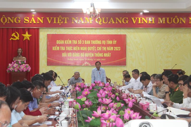 Phát biểu tại buổi kiểm tra, đồng chí Phạm Xuân Hà, Ủy viên Ban TVTU, Trưởng ban Tuyên giáo Tỉnh ủy, Trưởng đoàn kiểm tra đề nghị, ngoài các nội dung đã nêu trong báo cáo, Huyện ủy Thống Nhất cần bổ sung thêm một số nội dung, nhiệm vụ, giải pháp mà các thành viên trong đoàn kiểm tra đã chỉ ra tại buổi làm việc nhằm khắc phục những hạn chế trong năm 2023.