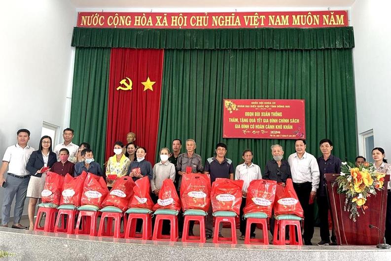 (CTT-Đồng Nai) - Chiều 23-1, Ủy viên thường trực Ủy ban Tư pháp của Quốc hội Nguyễn Công Long - Đại biểu Quốc hội đơn vị tỉnh Đồng Nai đã đến thăm và trao quà cho các gia đình chính sách, gia đình có hoàn cảnh khó khăn tại huyện Cẩm Mỹ. Tại đây, đại biểu đã trao 15 phần quà cho bà con, mỗi phần trị giá 1 triệu đồng.