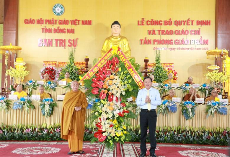 Ủy viên Ban TVTU, Trưởng ban Dân vận Tỉnh ủy Đào Văn Phước trao tặng lẳng hoa chúc mừng của Tỉnh ủy - HĐND - UBND - Ủy ban MTTQ Việt Nam tỉnh cho Ban tổ chức lễ công bố quyết định và trao giáo chỉ tấn phong giáo phẩm của Hội Đồng chứng minh Giáo hội Phật giáo Việt Nam cho tăng ni trên địa bàn tỉnh