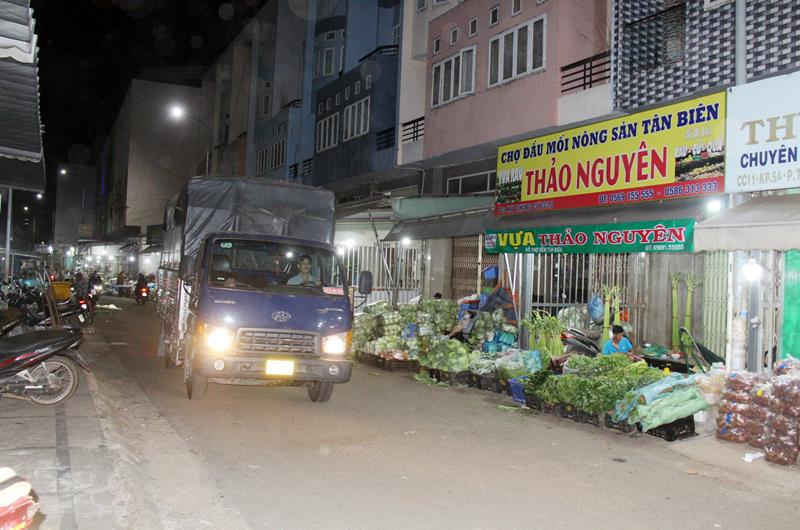 Giá nhiều loại rau xanh hiện vẫn đang ở mức cao do nguồn cung khan hàng vì tình hình thời tiết mưa nhiều và tác động từ các chi phí trung gian, giá cước vận tải chưa giảm nhiều dù giá xăng dầu đã giảm 5 lần liên tục. Trong ảnh: Hoạt động cung ứng nông sản, rau xanh tại chợ Tân Biên (TP.Biên Hòa)