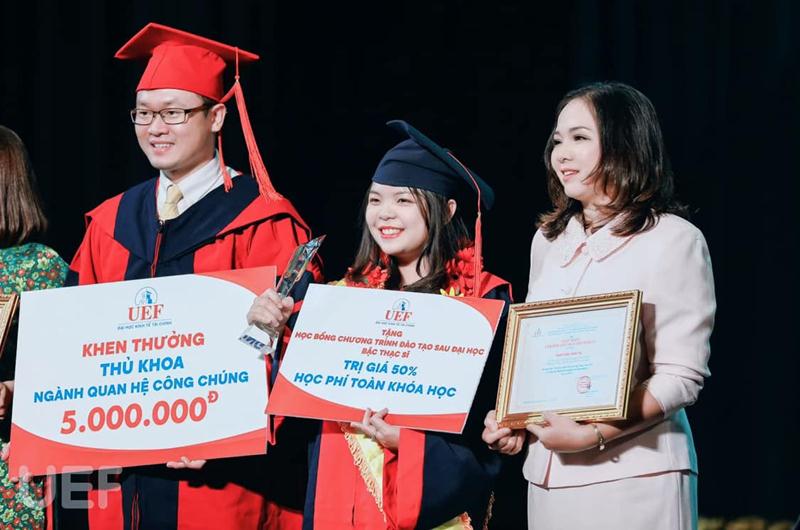 Minh Thư (người ở giữa) nhận học bổng chương trình thạc sĩ trong buổi lễ tốt nghiệp