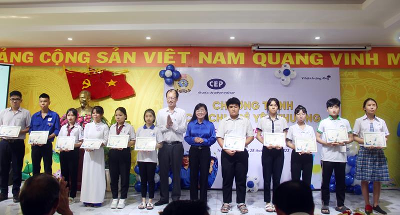 Đại diện Liên đoàn Lao động tỉnh và Tổ chức tài chính vi mô CEP trao các suất học bổng cho con của công nhân có hoàn cảnh khó khăn