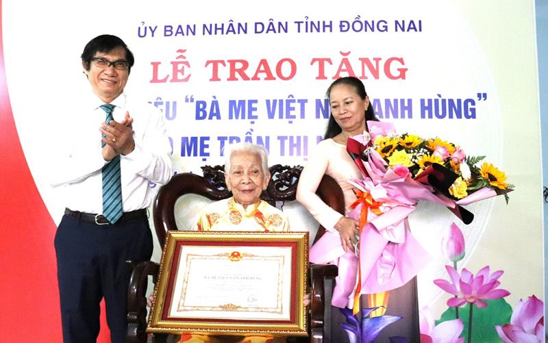 Thừa ủy quyền của Chủ tịch nước, Phó Chủ tịch UBND tỉnh Nguyễn Sơn Hùng trao tặng danh hiệu vinh dự Bà mẹ Việt Nam anh hùng cho mẹ Trần Thị Ngọc Anh, ngụ thị trấn Dầu Giây, huyện Thống Nhất