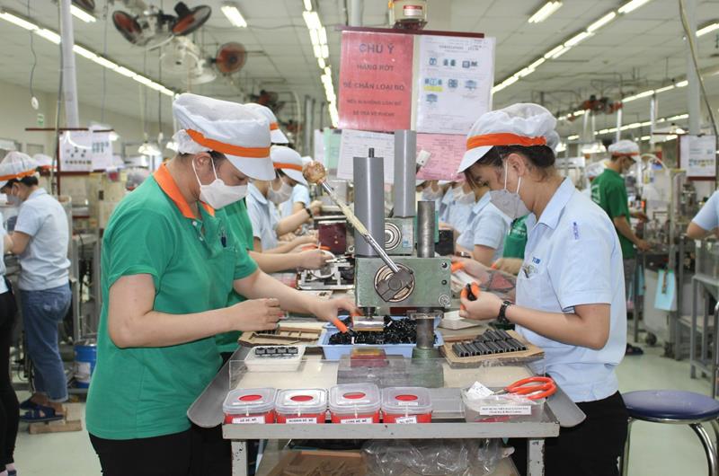Công nhân Công ty TNHH Tokin Electronics (Khu công nghiệp Loteco Long Bình, TP.Biên Hòa) thực hiện nghiêm văn hóa doanh nghiệp trong giờ sản xuất