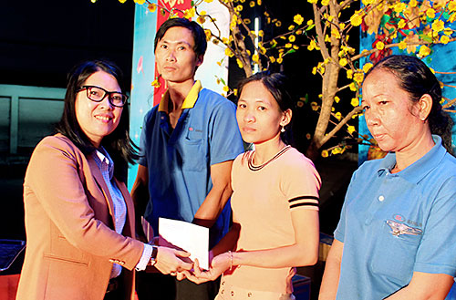 Phó Chủ tịch Thường trực LĐLĐ tỉnh Nguyễn Thị Như Ý tặng quà cho CNLĐ có hoàn cảnh khó khăn.