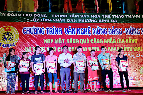 *Tối 7-2, LĐLĐ TP. Biên Hòa phối hợp với Trung tâm văn hóa TP. Biên Hòa và phường Bình Đa tổ chức đêm văn nghệ Mừng Đảng, mừng Xuân và họp mặt tặng quà cho công nhân lao động có hoàn cảnh khó khăn. Tại đây, LĐLĐ TP. Biên Hòa đã trao 80 phần quà cho công nhân có hoàn cảnh khó khăn, trong đó LĐLĐ tỉnh hỗ trợ 40 phần, mỗi phần trị giá 500.000 đồng. Cũng tại chương trình, phường Bình Đa đã trao 273 phần quà cho công nhân nghèo, trẻ em có hoàn cảnh khó khăn và các thương, bệnh binh.