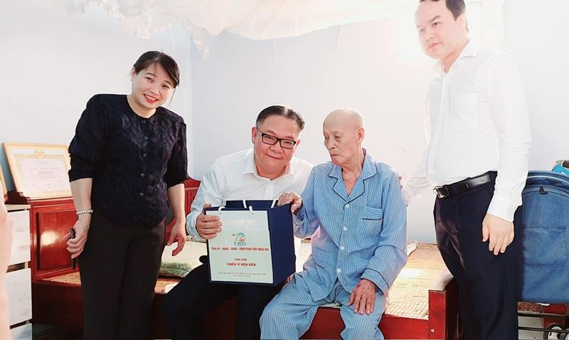 Chánh Văn phòng UBND tỉnh Nguyễn Kim Long (thứ 2 từ trái sang) trao quà của Tỉnh ủy, HĐND, UBND, Ủy ban MTTQ Việt Nam tỉnh cho cụ Đặng Đình Phúc, xã Bình Minh, huyện Trảng Bom.