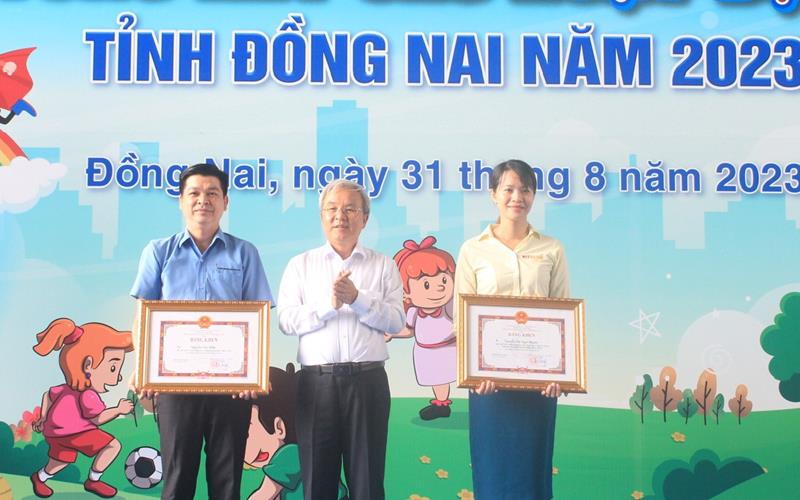 Đồng chí Nguyễn Sơn Hùng, Phó Chủ tịch UBND tỉnh, Trưởng Ban Chỉ đạo hè tỉnh trao bằng khen cho các tập thể