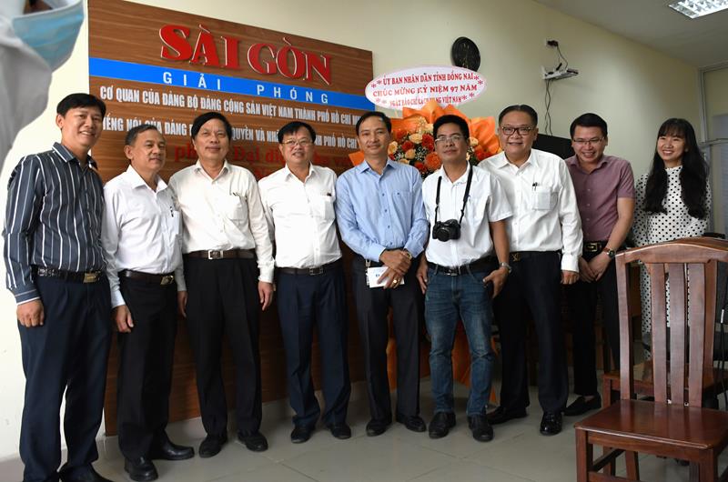 Chủ tịch UBND tỉnh Cao Tiến Dũng (thứ 4 từ trái sang) cùng các thành viên trong đoàn chụp hình lưu niệm với các nhà báo, phóng viên tại Văn phòng Báo Sài Gòn Giải Phóng tại Đồng Nai nhân kỷ niệm 97 năm Ngày Báo chí cách mạng Việt Nam (21/6/1925 - 21/6/2022),