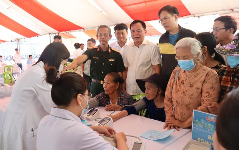 Bác sĩ Lê Quang Trí (thứ 2 trái qua) và Chủ tịch UBND tỉnh Võ Tấn Đức thăm, động viên người dân đến khám bệnh miễn phí