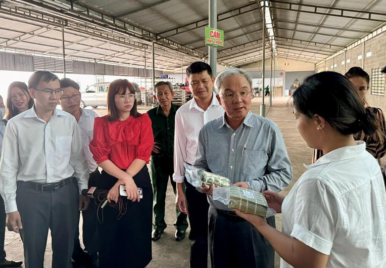 Chủ tịch Ủy ban MTTQ Việt Nam tỉnh Cao Văn Quang nghe giới thiệu về sản phẩm bánh chưng OCOP của cơ sở bánh chưng Trần Gia tại xã Tân Bình, huyện Vĩnh Cửu.