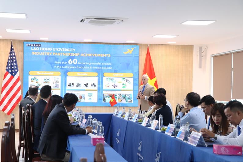 Chuyên gia của Trường Đại học Lạc Hồng giới thiệu về năng lực đào tạo của trường với đoàn công tác Cục Kinh tế và kinh doanh thuộc Bộ Ngoại giao Hoa Kỳ