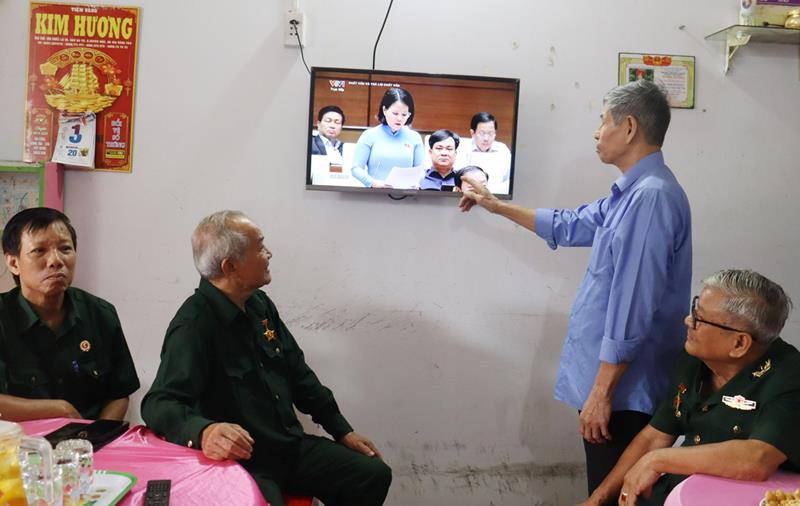 Ông Trần Kim Ảnh (người đứng), anh trai liệt sĩ Trần Kim Vĩnh giới thiệu chiếc ti vi được Hội Hỗ trợ gia đình liệt sĩ khảo sát, phối hợp trao tặng