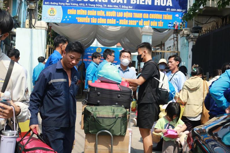 (CTT-Đồng Nai) - Mới đây, Liên đoàn Lao động (LĐLĐ) tỉnh đã tổ chức chương trình Chuyến tàu Công đoàn - Xuân 2025, tiễn hơn 100 gia đình đoàn viên, người lao động (NLĐ) cùng thân nhân về quê đón Tết. Chương trình do Tổng LĐLĐ Việt Nam hỗ trợ cho NLĐ về quê tại các tỉnh, thành phía Bắc. Tham dự có Phó Chủ tịch Tổng LĐLĐ Việt Nam Phan Văn Anh; Phó Chủ tịch UBND tỉnh Nguyễn Thị Hoàng cùng đại diện các sở, ban, ngành trong tỉnh.
