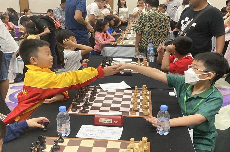 Bùi Quang Huy (trái) tham gia Giải cờ vua trẻ châu Á năm 2022 tổ chức tại Indonesia