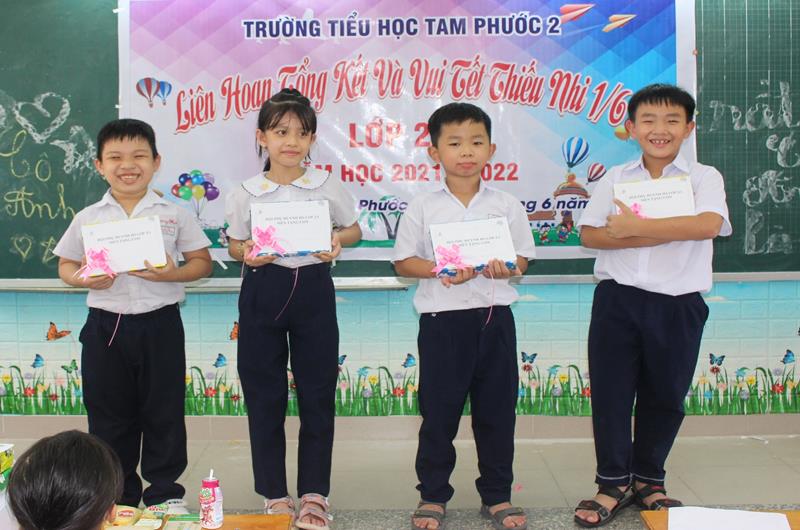 Bùi Quang Huy (thứ 2 phải qua) nhận phần thưởng tại lớp học