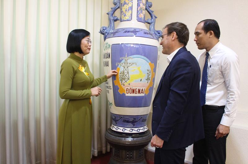 Phó Chủ tịch UBND tỉnh Nguyễn Thị Hoàng giới thiệu về Đồng Nai thông qua sản phẩm gốm, mặt hàng thủ công mỹ nghệ nổi tiếng của tỉnh cho ông David Gottlieb