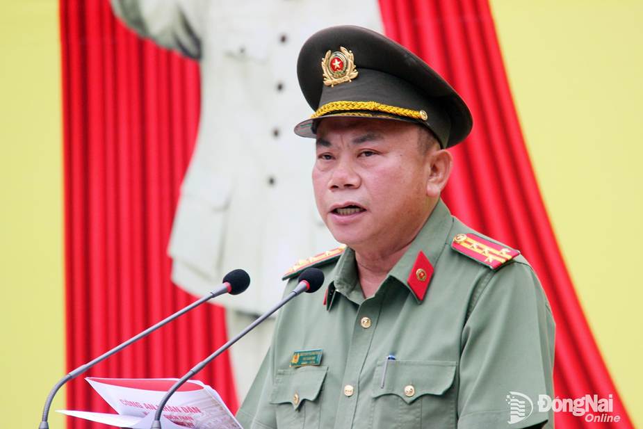 Đại tá Nguyễn Phương Đằng, Phó Giám đốc Công an tỉnh Đồng Nai phát biểu giao nhiệm vụ tại buổi lễ. Ảnh: Trần Danh