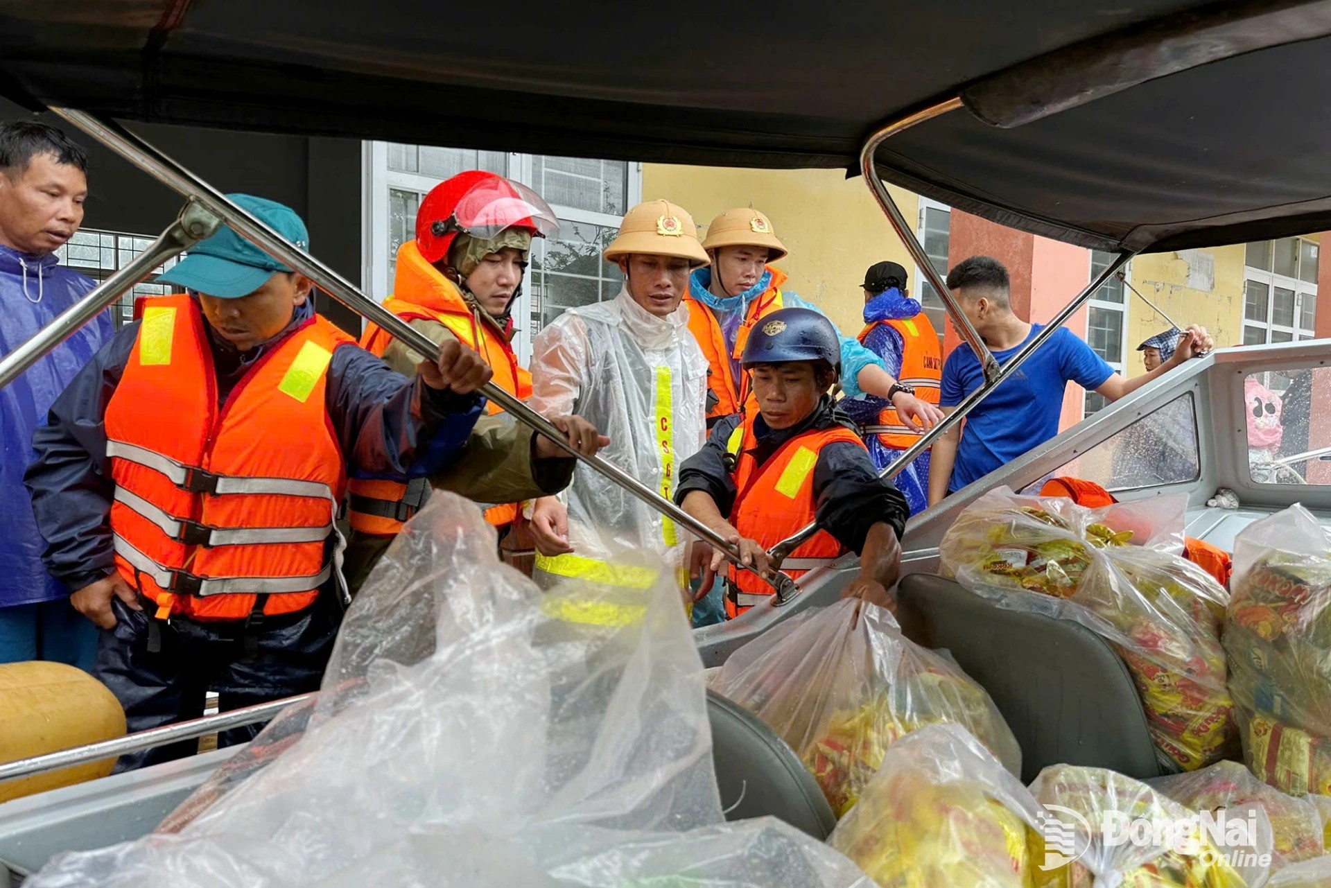 Các chiến sĩ Công an tỉnh Đồng Nai giúp người dân vùng lũ miền Trung. Ảnh: CAT