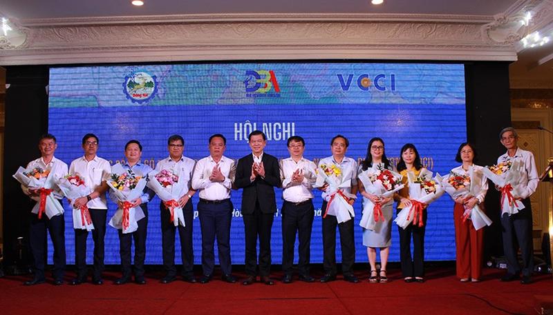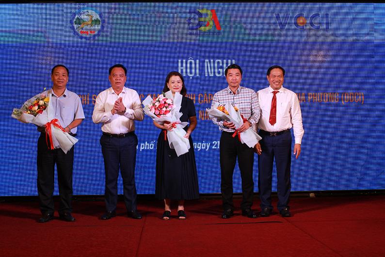 Quyền Chủ tịch UBND tỉnh Võ Tấn Đức và Chủ tịch Hiệp hội doanh nghiệp tỉnh Đồng Nai Đặng Văn Điềm tặng hoa cho các địa phương có điểm số năng lực cạnh tranh cao