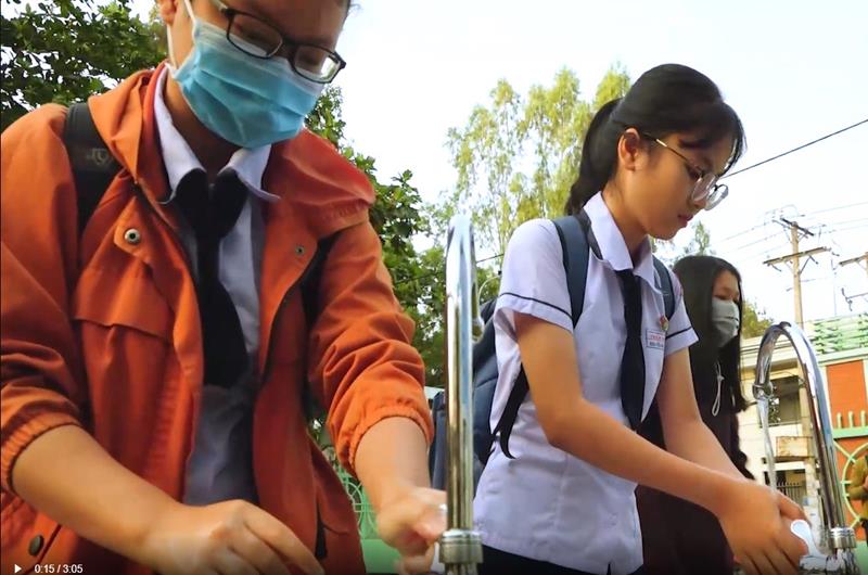 Học sinh Trường THPT Trấn Biên (TP.Biên Hòa) rửa tay tại trường trước khi vào lớp