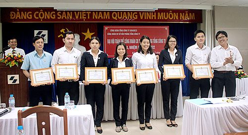 Chủ tịch Công đoàn Tổng công ty Sonadezi Trịnh Cường (bìa phải) trao giấy khen cho các tập thể, cá nhân tại Đại hội CĐCS Văn phòng Tổng công ty nhiệm kỳ 2017 - 2022.