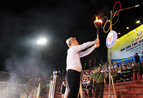 Sau màn diễu hành biểu dương lực lượng của khối nghi thức và 41 đoàn thể thao, ngọn đuốc truyền thống biểu trưng cho tinh thần thể thao và thượng võ trong thi đấu đã được 16 VÐV tiêu biểu của tỉnh do VÐV Nguyễn Thị Thu Hạnh (HCÐ môn cầu mây tại ASIAD 2018) dẫn đầu, rước vào sân vận động. Bí thư Tỉnh ủy Nguyễn Phú Cường đã nhận ngọn đuốc và thắp sáng đài lửa của Ðại hội. Ngọn lửa sẽ cháy suốt những ngày diễn ra các môn thi đấu của Ðại hội TDTT tỉnh.