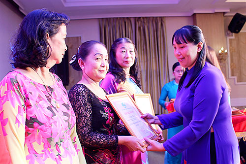 Phó Chủ tịch Hội LHPN tỉnh Lê Thị Thái khen thưởng các tập thể, cá nhân thực hiện hiệu quả Đề án 404 giai đoạn 1.