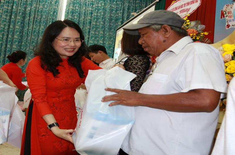 Phó Giám đốc Sở LĐ-TBXH Nguyễn Thị Mộng Thu tặng quà cho người làm công tác xã hội tại Trung tâm Công tác xã hội tỉnh nhân kỷ niệm Ngày Công tác xã hội 25-3-2023.