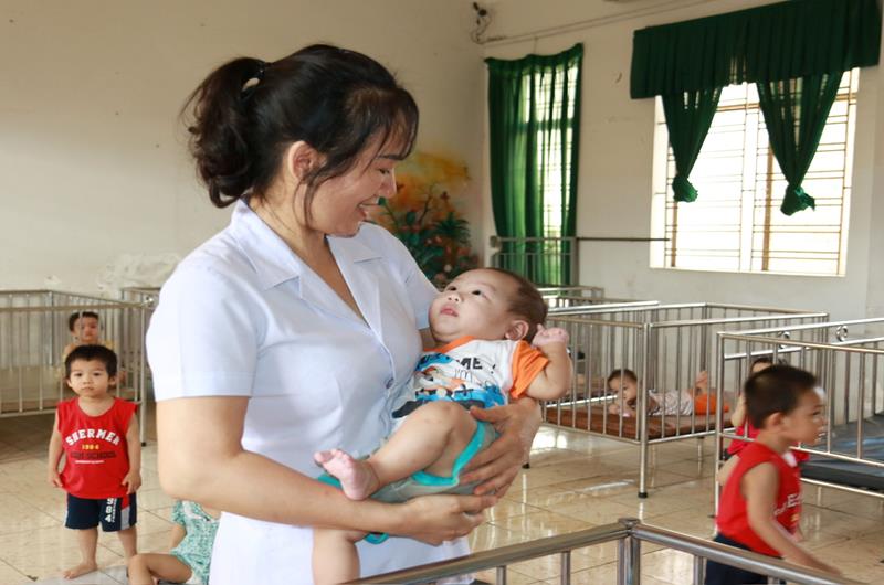 Bà Hoàng Thị Ánh, nhân viên Phòng Chăm sóc trẻ khuyết tật nhỏ (Trung tâm Công tác xã hội tỉnh) cho hay, năm 2012, khi cùng bạn vào thăm trẻ tại Trung tâm Công tác xã hội tỉnh, nhìn các bé ở đây, bà có một cảm xúc đặc biệt rất khó tả. Đúng thời điểm này, Trung tâm Công tác xã hội tỉnh thông báo tuyển dụng viên chức, vậy là bà đăng ký vào làm với tâm niệm: các cháu không có cha mẹ, người thân, vì vậy rất cần tình yêu thương, sự chăm sóc. “Cùng đợt với tôi còn có 8 người khác xin vào làm nhưng sau cùng còn mỗi mình tôi trụ lại đến nay đã 11 năm” - bà Ánh nói.