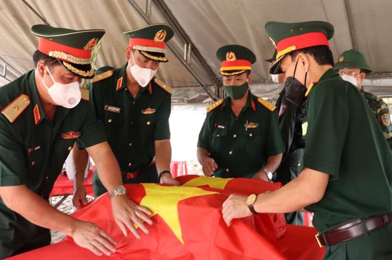 Thiếu tướng Nguyễn Trường Thắng (thứ 2 từ trái qua), Ủy viên Trung ương Đảng, Tư lệnh Quân khu 7 phủ Quốc kỳ quách các hài cốt liệt sĩ vừa tìm thấy tại Phước An, Nhơn Trạch