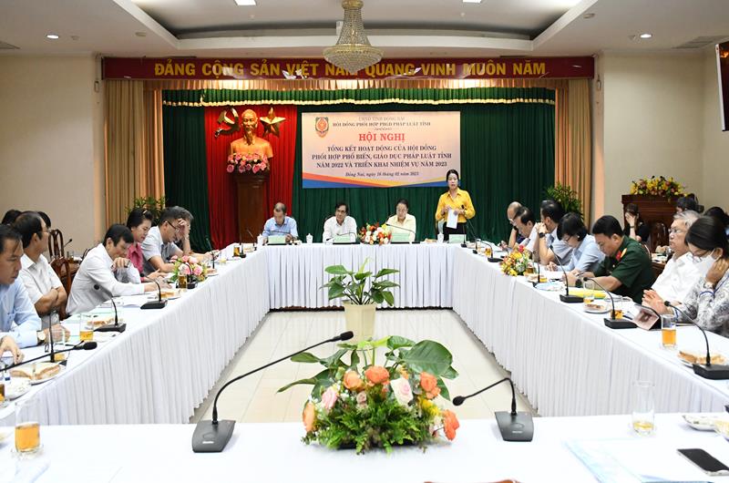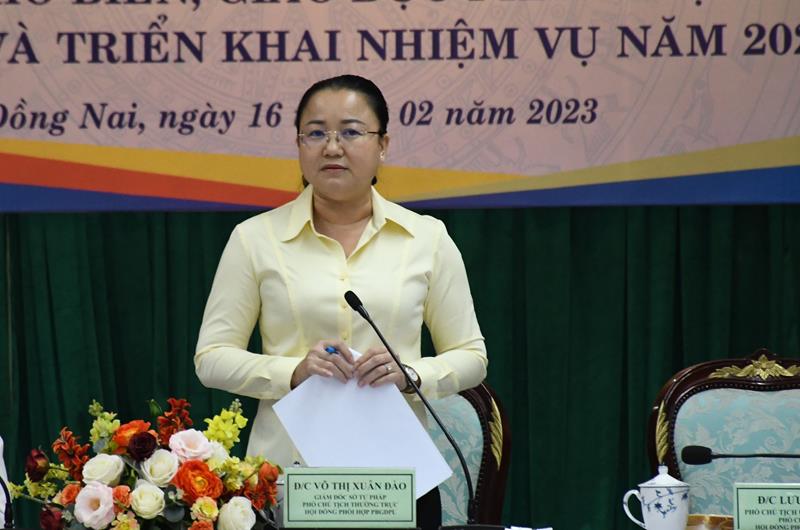 Giám đốc Sở Tư pháp, Phó Chủ tịch thường trực Hội đồng PHPBGDPL tỉnh Võ Thị Xuân Đào phát biểu tại hội nghị