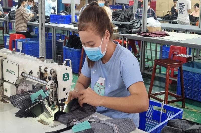 Nhiều lao động vẫn đang mong tiền hỗ trợ thuê trọ. Hình: Công nhân Công ty TNHH Kin Yip Bags & Hats Manufactory (H.Vĩnh Cửu) trong giờ làm việc