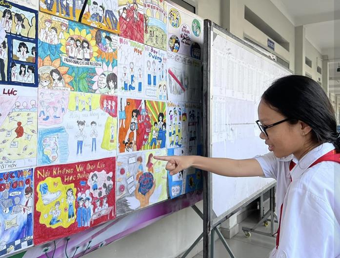 Học sinh xem tranh vẽ cổ động nói không với bạo lực học đường