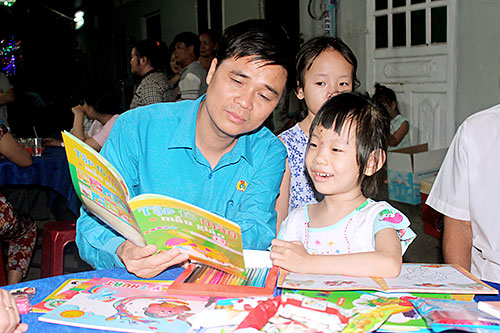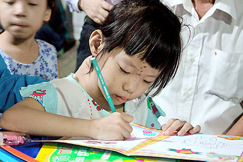 Phó Chủ tịch Tổng LĐLĐ Việt Nam Ngọ Duy Hiểu chỉ cho bé Thảo Lam học bài trong lần ghé thăm gia đình.