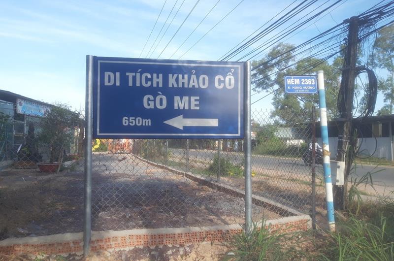 Bảng hướng dẫn lối vào di tích khảo cổ Gò Me, ấp Chính Nghĩa, xã Vĩnh Thanh, H.Nhơn Trạch