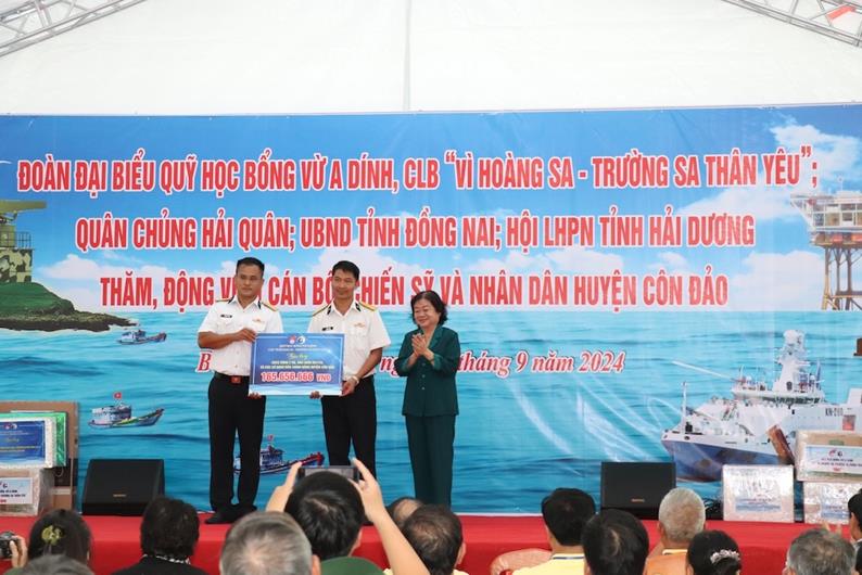 Nguyên Bí thư Trung ương Đảng, nguyên Phó Chủ tịch nước Trương Mỹ Hoa, Chủ tịch Quỹ học bổng Vừ A Dính, Chủ nhiệm Câu lạc bộ “Vì Hoàng Sa - Trường Sa thân yêu” tặng quà cho đại diện các lực lượng đang làm nhiêm vụ tại Côn Đảo