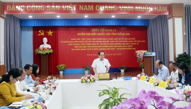 (CTT-Đồng Nai) - Ngày 29-8, Đoàn đại biểu Quốc hội tỉnh do Phó Bí thư Tỉnh ủy, Trưởng Đoàn đại biểu Quốc hội tỉnh Quản Minh Cường làm trưởng đoàn đã chủ trì buổi khảo sát việc thực hiện chính sách, pháp luật về hỗ trợ lãi suất từ ngân sách nhà nước để hỗ trợ doanh nghiệp tháo gỡ khó khăn, phục hồi sản xuất, kinh doanh, phát triển kinh tế - xã hội do ảnh hưởng của dịch Covid-19 trên địa bàn tỉnh từ năm 2020 đến cuối tháng 6-2023 tại Ngân hàng TMCP Công thương Việt Nam (VietinBank) chi nhánh Đồng Nai.