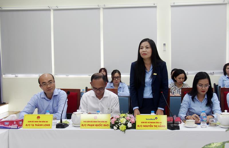 Giám đốc VietinBank chi nhánh Đồng Nai Nguyễn Thị Hằng báo cáo tình hình triển khai các chương trình hỗ trợ lãi suất phục vụ sản xuất, kinh doanh tại chi nhánh