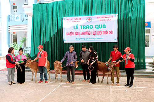 Theo đó, đoàn đã trao tặng 15 con bò giống (khoảng 13,5 triệu đồng/con) cho những hộ gia đình bị thiệt hại do mưa bão ở xã Mường Khiêng, huyện Thuận Châu, tỉnh Sơn La), giúp người dân nơi đây có điều kiện chăn nuôi làm kinh tế, vượt qua khó khăn. Cùng ngày, đoàn đã đến thăm Trường THCS Mường Khiêng (xã Mường Khiêng, huyện Thuận Châu, tỉnh Sơn La) trao tặng 1 bồn chứa nước sinh hoạt và chăn, màn, bánh kẹo cho 300 học sinh. Tổng kinh phí cứu trợ tại tỉnh Sơn La là 235 triệu đồng.