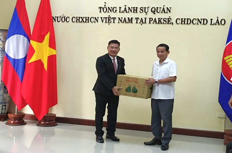 Nhân dịp này, đồng chí Hồ Thanh Sơn - Phó Bí thư Thường trực Tỉnh ủy đã trao tặng số tiền 50 triệu đồng hỗ trợ Tổng Lãnh sự quán nước CHXHCN Việt Nam tại Pakse tổ chức Chương trình kết nối thúc đẩy đầu tư, thương mại, du lịch Việt Nam - Lào - Thái Lan từ ngày 9 và 10-4-2023 tại Champasak.