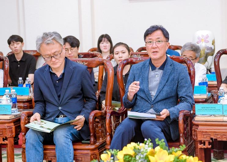 Chủ tịch Liên đoàn Lao động tỉnh Gyeonggi, Hàn Quốc ông Kim Yeon Pung (bên phải) trao đổi tại buổi làm việc