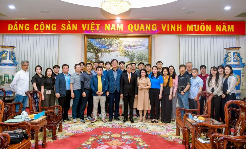 Các thành viên Đoàn Liên đoàn Lao động tỉnh Gyeonggi, Hàn Quốc chụp hình lưu niệm cùng lãnh đạo và đại diện các sở, ngành của tỉnh